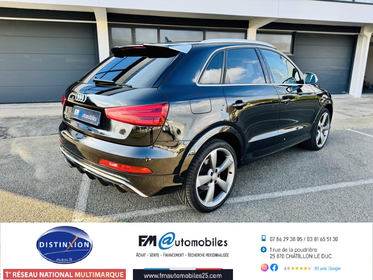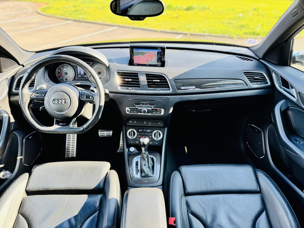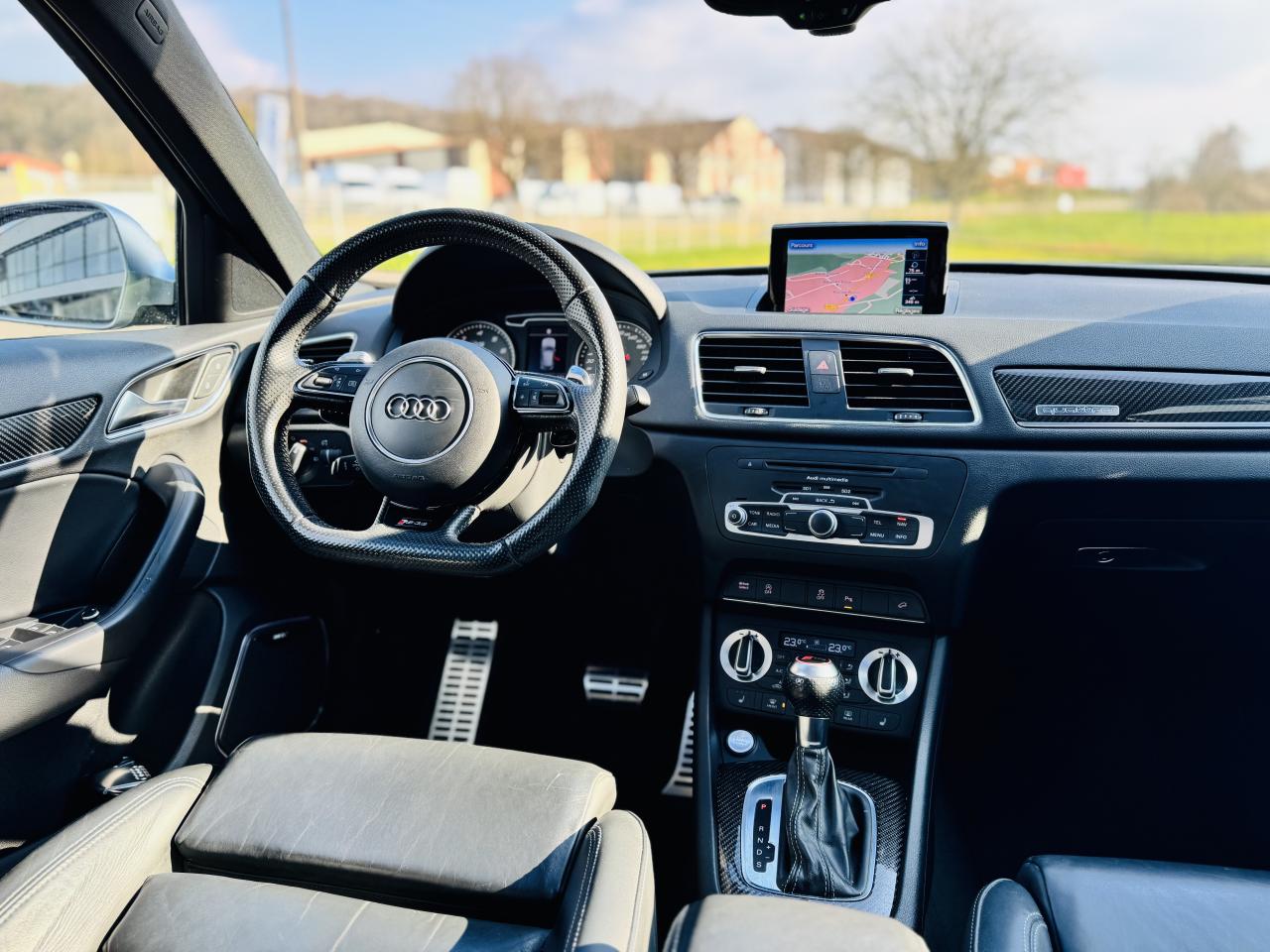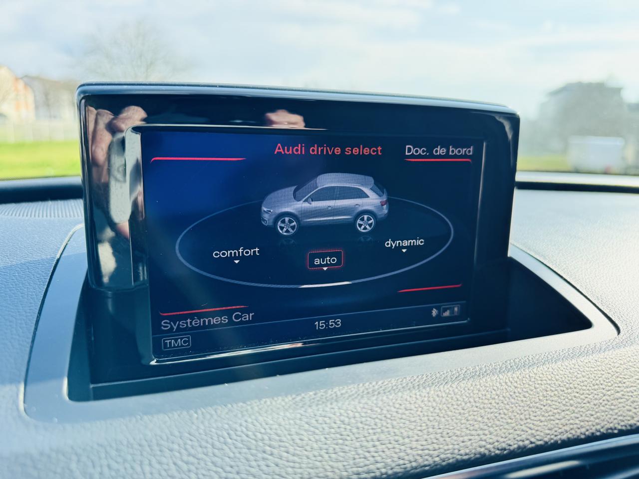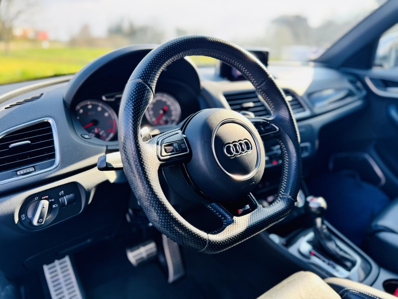 ABS (antiblocage de roues) / EBV (répartiteur de freinage) / ASR (antipatinage) / assistance hydraulique au freinage d'urgenceAccoudoir central à l'avant coulissant en longueur, inclinaison réglable ; avec videpoches relevable et une prise 12 volts dans la console centrale à l'arrièreAdvanced Key : système d'autorisation d'accès et de démarrage main libreAirbags conducteur et passagerAirbags frontaux grand volume conducteur et passagerApplications décoratives en piano laqué noirAppuie-têtes intégraux à l'avant et à l'arrièreAudi drive select : commande la configuration de la direction, du moteur, de la transmission et de la suspension du véhicule modifiables selon 3 modesAudi Music InterfaceAudi parking system plus : signal acoustique d'aide au stationnement avant et arrière par pictogrammes sur l'écranAudi Singleframe, calandre avec grille à structure alvéolée noir brillant et encadrement d'une seule pièce style aluminium matAudi Tracking System : système d'immobilisation et de localisation du véhicule par satelliteBanquette arrière 3 places rabattable en deux parties, 40:60 ou complètementBecquet de pavillon RS sur le capot de coffre, laqué dans la couleur de la carrosserieBoîte de vitesses S tronic à 7 rapportsBose surround sound (14 HP / 465 W)Carrosserie galvanisée (entièrement galvanisée aux endroits sensibles à la corrosion) : autoportante, soudée au groupe-plancher, zones de déformation définies à l'avant et à l'arrièreCeintures de sécurité trois points à toutes les placesChâssis Sport RS avec tarage dynamique des ressorts et des amortisseursCiel de pavillon en tissu noirClé radiocommandée avec ouverture/fermeture confort pour les vitres électriques et le toit ouvrant coulissantClignotants avec fonction autoroute : une brève impulsion sur le comodo active 3 cycles de clignotementClimatisation automatique "Confort"Colonne de direction réglable électriquement en hauteur et en profondeurContrôle de la pression des pneus avec signaux acoustique et visuel de perte de pressionDémarrage et arrêt du moteur par simple impulsion sur le bouton moteur Start/StopDétecteur de pluie et de luminosité incluant rétroviseur intérieur jour/nuit automatiqueDirection assistée électromécanique sans entretien avec assistance asservie à la vitesseÉclairage d'ambiance intérieur et extérieur à LEDEclairage et catadioptre actifs sur toutes les portièresEcrous antivolEDS (blocage électronique de différentiel) / ESC (contrôle électronique de stabilisation)Feux de freinage adaptatifs et clignotants lors d'un freinage d'urgence (déclenchement des feux de détresse automatique)Feux de route assistés : gestion automatique du passage de feux de croisement à pleins phares et inversementFixations pour sièges enfant ISOFIX aux places extérieures arrièreFrein de stationnement electromécaniqueIdentification du modèle à l'arrière, inscription “quattro” à l'arrière, sur la calandre et sur le tableau de bord côté passager avant ; sur demande sans identification du modèleInscription « quattro » sur le tableau de bord côté passagerInscription « RS Q3 » sur la calandre, le capot de coffre, les étriers de freins avant, le volant Sport en cuir et le tachymètreInserts de seuils de portes en aluminium et logo « RS Q3 »Instrumentation de bord spécifique RS avec écran couleur HD TFT 3,5”Interface Bluetooth avec Bluetooth AudiostreamingPack navigation plus avec données de navigation (carte SD)Pack rangement + Pack coffrePare-Brise feuilleté AthermiquePare-chocs avant et arrière au design résolument spécifique RSPare-soleil avec miroirs de courtoisie éclairés, conducteur et passager avantPoignées de maintien avec mécanisme amortisseur : quatre poignées encastrées dans le ciel de pavillonPorte-boissons double dans la console centralePréparation pour crochet d'attelage comprend câblage jusqu'au logement de la roue de secours, système approprié de refroidissement du moteurProjecteurs Xénon Plus incluant lave-phares, feux de jour à LED et réglage automatique du site des pharesProtection antidémarrage électronique, intégrée à la gestion du moteur, activation automatique par la clé du véhiculeProtections latérales anticollisionRampes de pavillon en aluminium matRéglages électriques du support lombaireRégulateur de vitesseRétroviseurs extérieurs aluminium mat, escamotables électriquement, dégivrants, jour/nuit automatiques côté conducteur et buses de lave-glaces dégivrantesSécurité enfants sur les portières et les vitres électriques arrièreSellerie cuir Nappa fin avec surpiqûres contrastées et embossée RS Q3Sièges avant avec réglage manuel de la hauteur, de la longueur et des appuie-tête, ainsi que réglage de l‘inclinaison du dossierSièges Sport à l'avantSorties d'échappement RS avec embout ovale chromé à gaucheSystème de freinage RS, système de freinage haute performance 18 pouces avec circuit en diagonaleSystème de récupération d'énergie générée lors des phases de freinage ou de décélération / système Start/StopTapis de sol complémentaires avant et arrière dans la couleur de la moquetteTire Mobility System : compresseur et produit de colmatage en cas de crevaisonTransmission intégrale permanente quattro à embrayage multidisques piloté, avec répartition du couple variable (90:10)Triangle de présignalisation, trousse de secours et outillage de bordVerrouillage centralisé avec fonction Autolock et télécommande à fréquence radio intégrée dans la clé du véhiculeVolant Sport multifonction RS en cuir style 3 branches, aplati en bas avec palettes de changement de vitesses style aluminium et emblème RS Q3