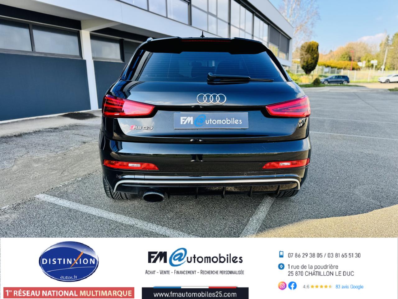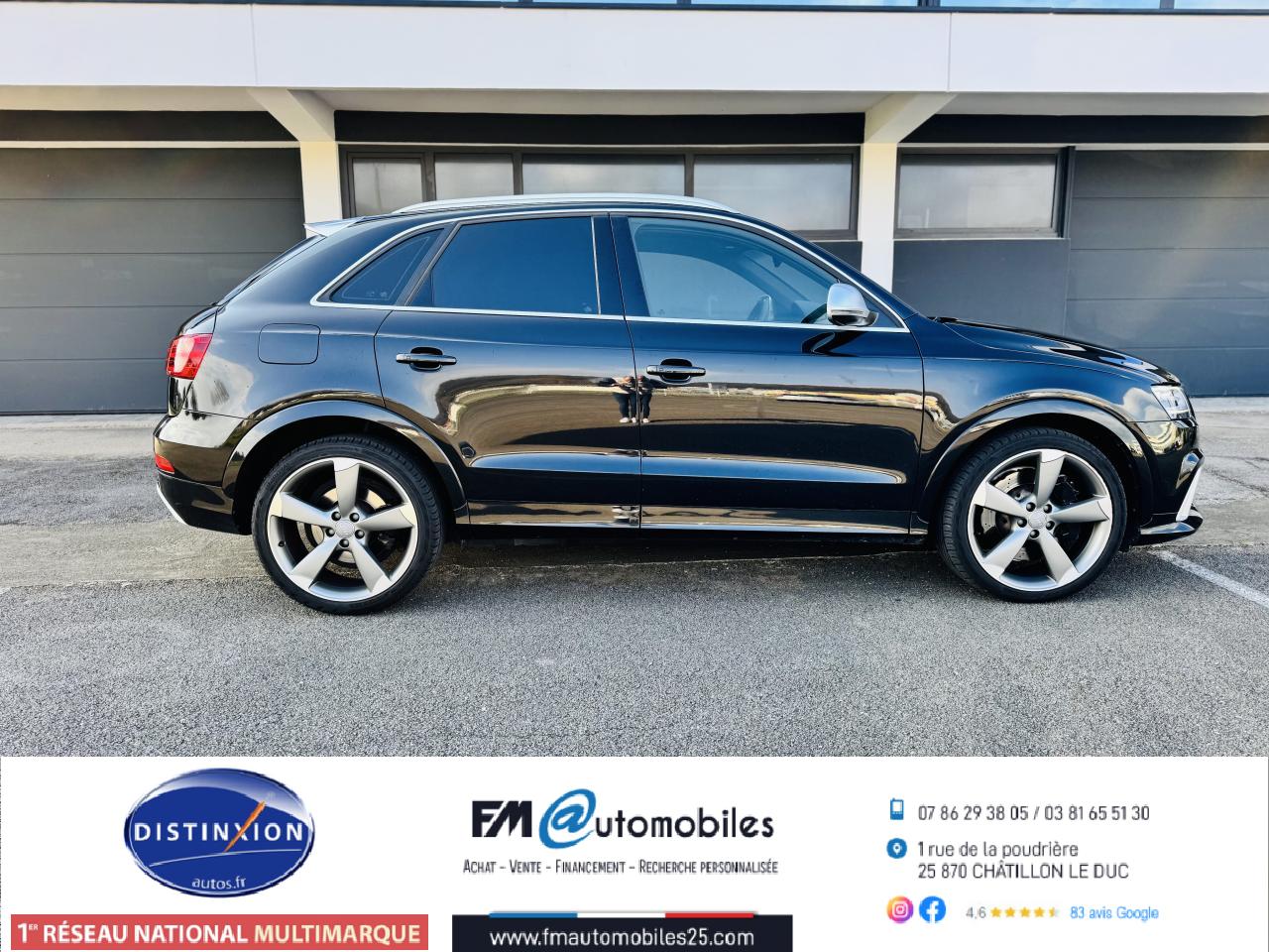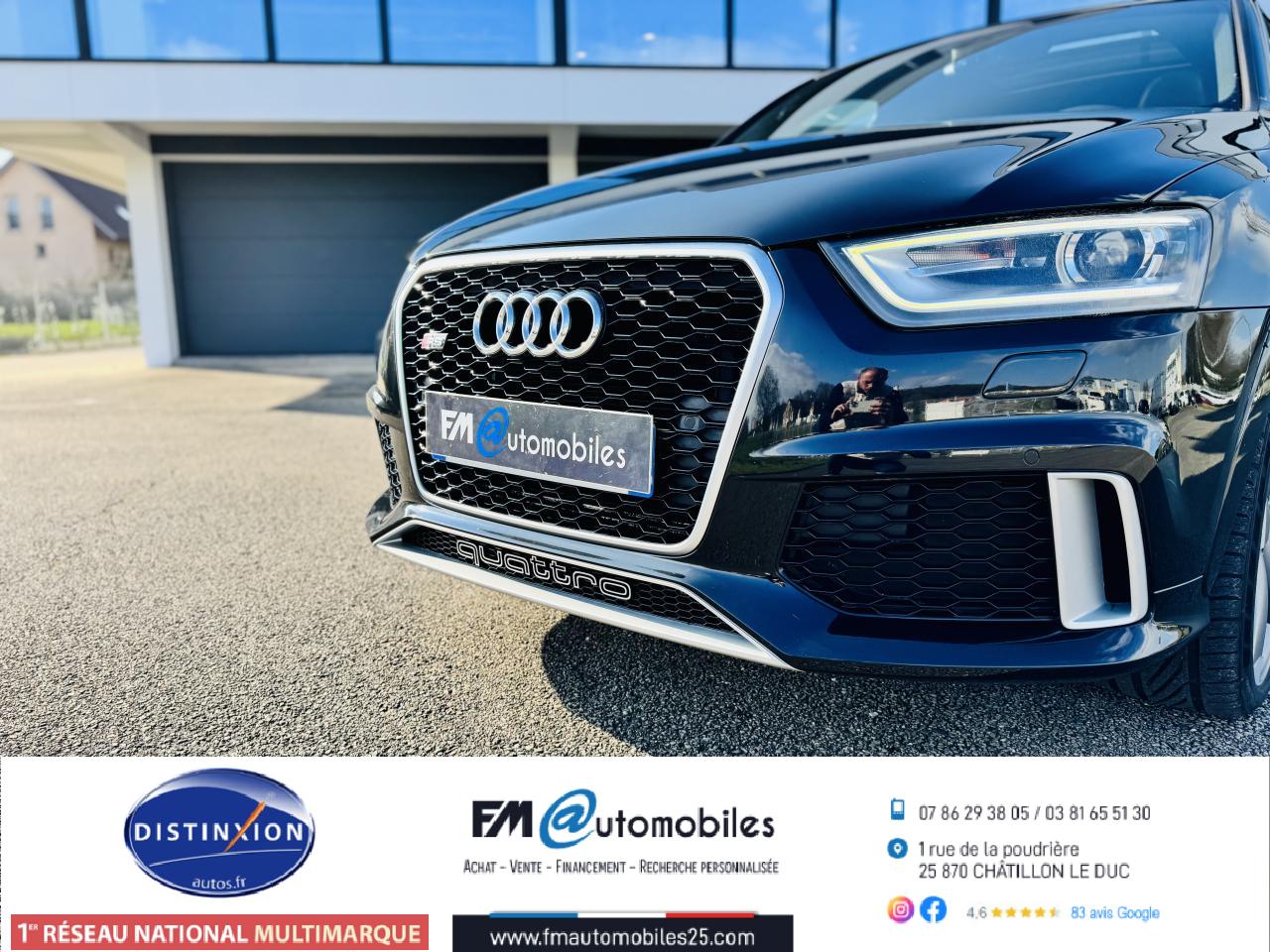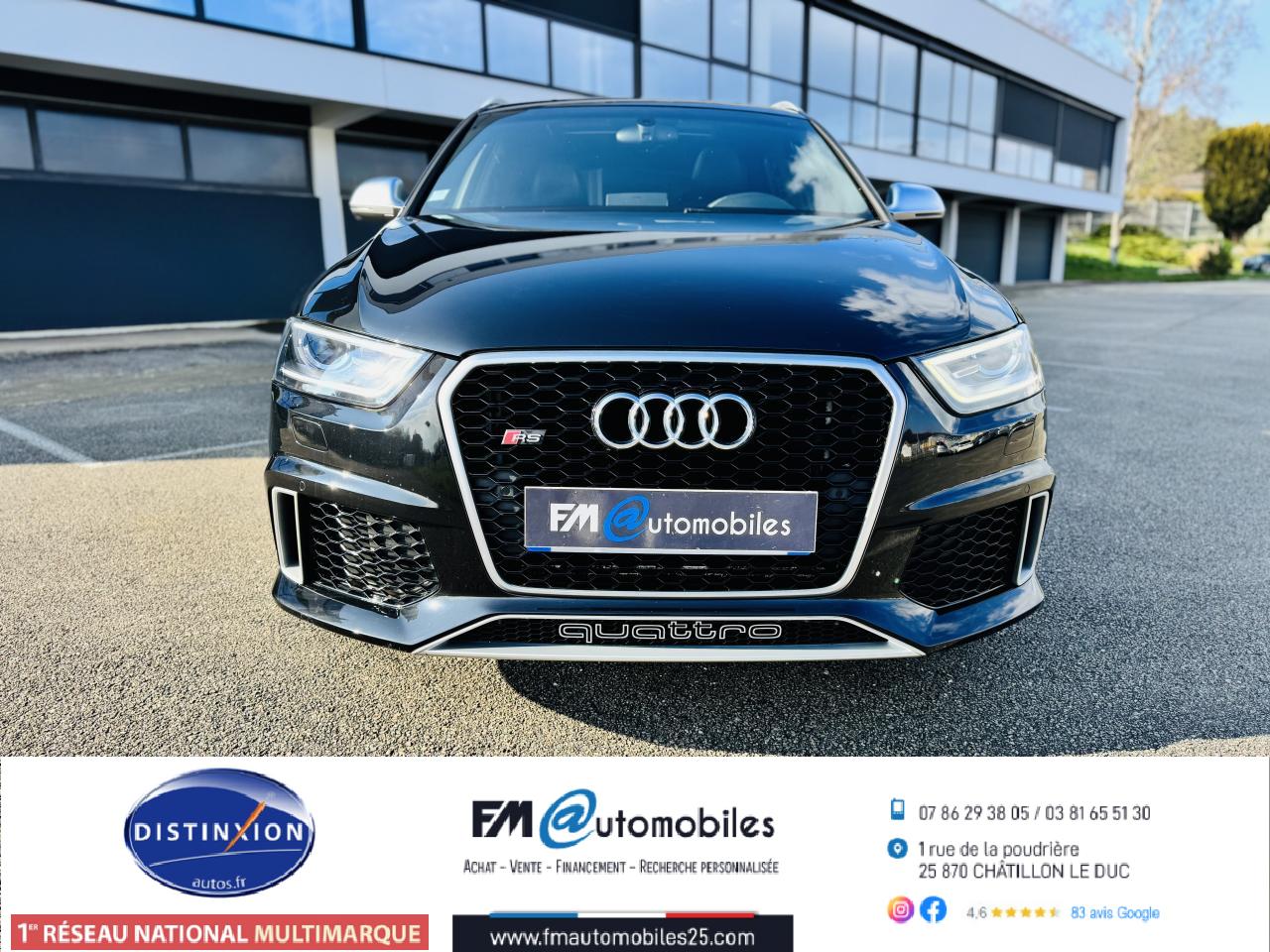 ABS (antiblocage de roues) / EBV (répartiteur de freinage) / ASR (antipatinage) / assistance hydraulique au freinage d'urgenceAccoudoir central à l'avant coulissant en longueur, inclinaison réglable ; avec videpoches relevable et une prise 12 volts dans la console centrale à l'arrièreAdvanced Key : système d'autorisation d'accès et de démarrage main libreAirbags conducteur et passagerAirbags frontaux grand volume conducteur et passagerApplications décoratives en piano laqué noirAppuie-têtes intégraux à l'avant et à l'arrièreAudi drive select : commande la configuration de la direction, du moteur, de la transmission et de la suspension du véhicule modifiables selon 3 modesAudi Music InterfaceAudi parking system plus : signal acoustique d'aide au stationnement avant et arrière par pictogrammes sur l'écranAudi Singleframe, calandre avec grille à structure alvéolée noir brillant et encadrement d'une seule pièce style aluminium matAudi Tracking System : système d'immobilisation et de localisation du véhicule par satelliteBanquette arrière 3 places rabattable en deux parties, 40:60 ou complètementBecquet de pavillon RS sur le capot de coffre, laqué dans la couleur de la carrosserieBoîte de vitesses S tronic à 7 rapportsBose surround sound (14 HP / 465 W)Carrosserie galvanisée (entièrement galvanisée aux endroits sensibles à la corrosion) : autoportante, soudée au groupe-plancher, zones de déformation définies à l'avant et à l'arrièreCeintures de sécurité trois points à toutes les placesChâssis Sport RS avec tarage dynamique des ressorts et des amortisseursCiel de pavillon en tissu noirClé radiocommandée avec ouverture/fermeture confort pour les vitres électriques et le toit ouvrant coulissantClignotants avec fonction autoroute : une brève impulsion sur le comodo active 3 cycles de clignotementClimatisation automatique "Confort"Colonne de direction réglable électriquement en hauteur et en profondeurContrôle de la pression des pneus avec signaux acoustique et visuel de perte de pressionDémarrage et arrêt du moteur par simple impulsion sur le bouton moteur Start/StopDétecteur de pluie et de luminosité incluant rétroviseur intérieur jour/nuit automatiqueDirection assistée électromécanique sans entretien avec assistance asservie à la vitesseÉclairage d'ambiance intérieur et extérieur à LEDEclairage et catadioptre actifs sur toutes les portièresEcrous antivolEDS (blocage électronique de différentiel) / ESC (contrôle électronique de stabilisation)Feux de freinage adaptatifs et clignotants lors d'un freinage d'urgence (déclenchement des feux de détresse automatique)Feux de route assistés : gestion automatique du passage de feux de croisement à pleins phares et inversementFixations pour sièges enfant ISOFIX aux places extérieures arrièreFrein de stationnement electromécaniqueIdentification du modèle à l'arrière, inscription “quattro” à l'arrière, sur la calandre et sur le tableau de bord côté passager avant ; sur demande sans identification du modèleInscription « quattro » sur le tableau de bord côté passagerInscription « RS Q3 » sur la calandre, le capot de coffre, les étriers de freins avant, le volant Sport en cuir et le tachymètreInserts de seuils de portes en aluminium et logo « RS Q3 »Instrumentation de bord spécifique RS avec écran couleur HD TFT 3,5”Interface Bluetooth avec Bluetooth AudiostreamingPack navigation plus avec données de navigation (carte SD)Pack rangement + Pack coffrePare-Brise feuilleté AthermiquePare-chocs avant et arrière au design résolument spécifique RSPare-soleil avec miroirs de courtoisie éclairés, conducteur et passager avantPoignées de maintien avec mécanisme amortisseur : quatre poignées encastrées dans le ciel de pavillonPorte-boissons double dans la console centralePréparation pour crochet d'attelage comprend câblage jusqu'au logement de la roue de secours, système approprié de refroidissement du moteurProjecteurs Xénon Plus incluant lave-phares, feux de jour à LED et réglage automatique du site des pharesProtection antidémarrage électronique, intégrée à la gestion du moteur, activation automatique par la clé du véhiculeProtections latérales anticollisionRampes de pavillon en aluminium matRéglages électriques du support lombaireRégulateur de vitesseRétroviseurs extérieurs aluminium mat, escamotables électriquement, dégivrants, jour/nuit automatiques côté conducteur et buses de lave-glaces dégivrantesSécurité enfants sur les portières et les vitres électriques arrièreSellerie cuir Nappa fin avec surpiqûres contrastées et embossée RS Q3Sièges avant avec réglage manuel de la hauteur, de la longueur et des appuie-tête, ainsi que réglage de l‘inclinaison du dossierSièges Sport à l'avantSorties d'échappement RS avec embout ovale chromé à gaucheSystème de freinage RS, système de freinage haute performance 18 pouces avec circuit en diagonaleSystème de récupération d'énergie générée lors des phases de freinage ou de décélération / système Start/StopTapis de sol complémentaires avant et arrière dans la couleur de la moquetteTire Mobility System : compresseur et produit de colmatage en cas de crevaisonTransmission intégrale permanente quattro à embrayage multidisques piloté, avec répartition du couple variable (90:10)Triangle de présignalisation, trousse de secours et outillage de bordVerrouillage centralisé avec fonction Autolock et télécommande à fréquence radio intégrée dans la clé du véhiculeVolant Sport multifonction RS en cuir style 3 branches, aplati en bas avec palettes de changement de vitesses style aluminium et emblème RS Q3