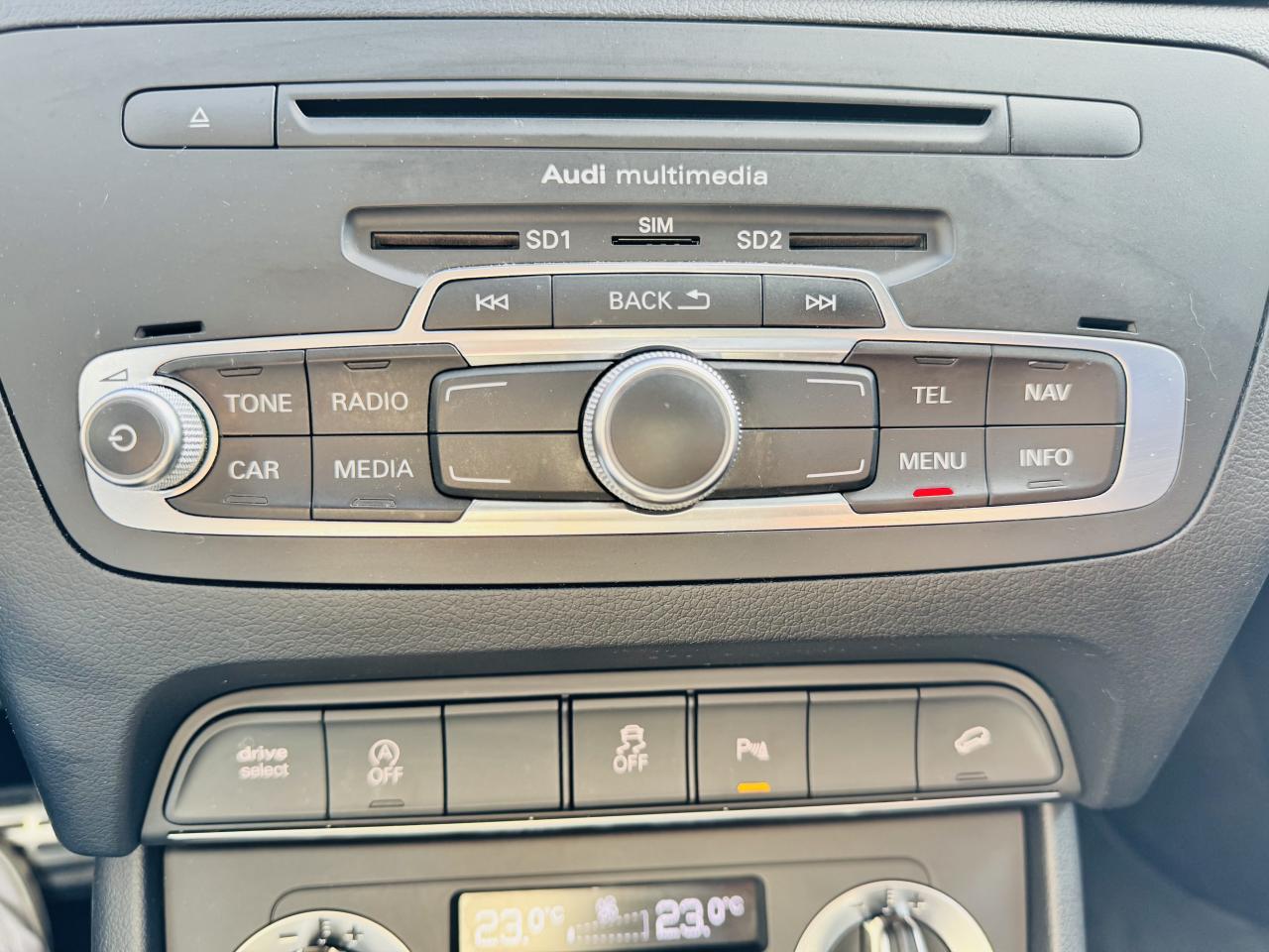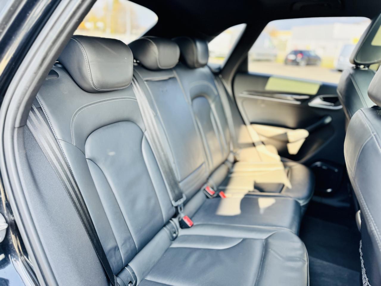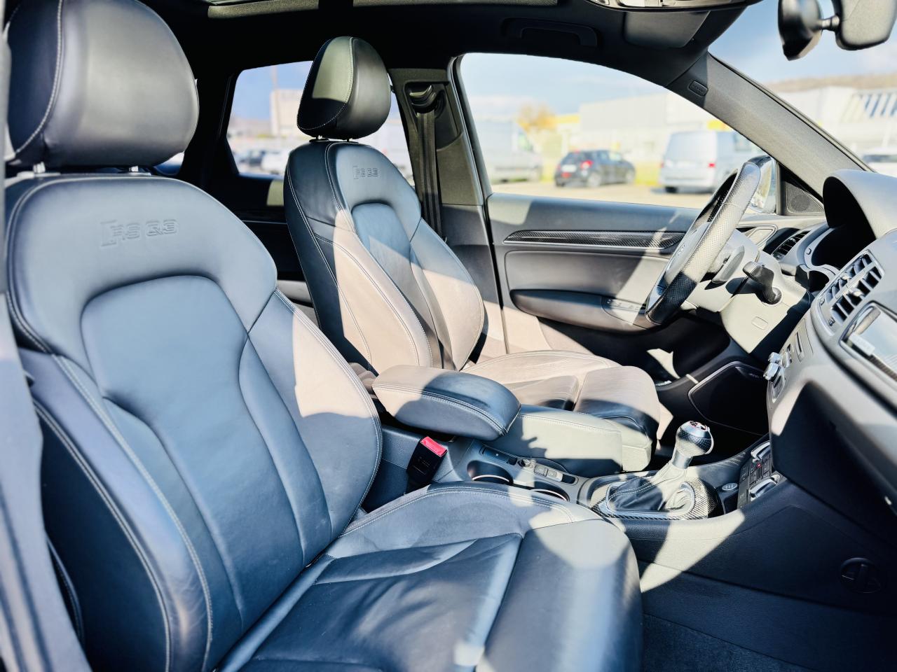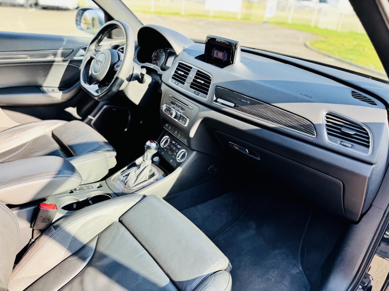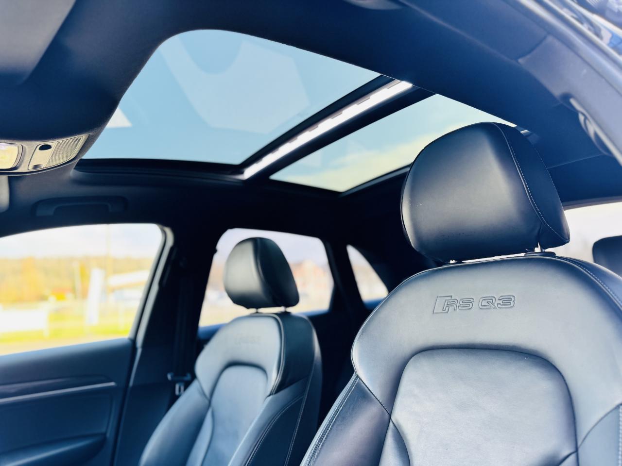 ABS (antiblocage de roues) / EBV (répartiteur de freinage) / ASR (antipatinage) / assistance hydraulique au freinage d'urgenceAccoudoir central à l'avant coulissant en longueur, inclinaison réglable ; avec videpoches relevable et une prise 12 volts dans la console centrale à l'arrièreAdvanced Key : système d'autorisation d'accès et de démarrage main libreAirbags conducteur et passagerAirbags frontaux grand volume conducteur et passagerApplications décoratives en piano laqué noirAppuie-têtes intégraux à l'avant et à l'arrièreAudi drive select : commande la configuration de la direction, du moteur, de la transmission et de la suspension du véhicule modifiables selon 3 modesAudi Music InterfaceAudi parking system plus : signal acoustique d'aide au stationnement avant et arrière par pictogrammes sur l'écranAudi Singleframe, calandre avec grille à structure alvéolée noir brillant et encadrement d'une seule pièce style aluminium matAudi Tracking System : système d'immobilisation et de localisation du véhicule par satelliteBanquette arrière 3 places rabattable en deux parties, 40:60 ou complètementBecquet de pavillon RS sur le capot de coffre, laqué dans la couleur de la carrosserieBoîte de vitesses S tronic à 7 rapportsBose surround sound (14 HP / 465 W)Carrosserie galvanisée (entièrement galvanisée aux endroits sensibles à la corrosion) : autoportante, soudée au groupe-plancher, zones de déformation définies à l'avant et à l'arrièreCeintures de sécurité trois points à toutes les placesChâssis Sport RS avec tarage dynamique des ressorts et des amortisseursCiel de pavillon en tissu noirClé radiocommandée avec ouverture/fermeture confort pour les vitres électriques et le toit ouvrant coulissantClignotants avec fonction autoroute : une brève impulsion sur le comodo active 3 cycles de clignotementClimatisation automatique "Confort"Colonne de direction réglable électriquement en hauteur et en profondeurContrôle de la pression des pneus avec signaux acoustique et visuel de perte de pressionDémarrage et arrêt du moteur par simple impulsion sur le bouton moteur Start/StopDétecteur de pluie et de luminosité incluant rétroviseur intérieur jour/nuit automatiqueDirection assistée électromécanique sans entretien avec assistance asservie à la vitesseÉclairage d'ambiance intérieur et extérieur à LEDEclairage et catadioptre actifs sur toutes les portièresEcrous antivolEDS (blocage électronique de différentiel) / ESC (contrôle électronique de stabilisation)Feux de freinage adaptatifs et clignotants lors d'un freinage d'urgence (déclenchement des feux de détresse automatique)Feux de route assistés : gestion automatique du passage de feux de croisement à pleins phares et inversementFixations pour sièges enfant ISOFIX aux places extérieures arrièreFrein de stationnement electromécaniqueIdentification du modèle à l'arrière, inscription “quattro” à l'arrière, sur la calandre et sur le tableau de bord côté passager avant ; sur demande sans identification du modèleInscription « quattro » sur le tableau de bord côté passagerInscription « RS Q3 » sur la calandre, le capot de coffre, les étriers de freins avant, le volant Sport en cuir et le tachymètreInserts de seuils de portes en aluminium et logo « RS Q3 »Instrumentation de bord spécifique RS avec écran couleur HD TFT 3,5”Interface Bluetooth avec Bluetooth AudiostreamingPack navigation plus avec données de navigation (carte SD)Pack rangement + Pack coffrePare-Brise feuilleté AthermiquePare-chocs avant et arrière au design résolument spécifique RSPare-soleil avec miroirs de courtoisie éclairés, conducteur et passager avantPoignées de maintien avec mécanisme amortisseur : quatre poignées encastrées dans le ciel de pavillonPorte-boissons double dans la console centralePréparation pour crochet d'attelage comprend câblage jusqu'au logement de la roue de secours, système approprié de refroidissement du moteurProjecteurs Xénon Plus incluant lave-phares, feux de jour à LED et réglage automatique du site des pharesProtection antidémarrage électronique, intégrée à la gestion du moteur, activation automatique par la clé du véhiculeProtections latérales anticollisionRampes de pavillon en aluminium matRéglages électriques du support lombaireRégulateur de vitesseRétroviseurs extérieurs aluminium mat, escamotables électriquement, dégivrants, jour/nuit automatiques côté conducteur et buses de lave-glaces dégivrantesSécurité enfants sur les portières et les vitres électriques arrièreSellerie cuir Nappa fin avec surpiqûres contrastées et embossée RS Q3Sièges avant avec réglage manuel de la hauteur, de la longueur et des appuie-tête, ainsi que réglage de l‘inclinaison du dossierSièges Sport à l'avantSorties d'échappement RS avec embout ovale chromé à gaucheSystème de freinage RS, système de freinage haute performance 18 pouces avec circuit en diagonaleSystème de récupération d'énergie générée lors des phases de freinage ou de décélération / système Start/StopTapis de sol complémentaires avant et arrière dans la couleur de la moquetteTire Mobility System : compresseur et produit de colmatage en cas de crevaisonTransmission intégrale permanente quattro à embrayage multidisques piloté, avec répartition du couple variable (90:10)Triangle de présignalisation, trousse de secours et outillage de bordVerrouillage centralisé avec fonction Autolock et télécommande à fréquence radio intégrée dans la clé du véhiculeVolant Sport multifonction RS en cuir style 3 branches, aplati en bas avec palettes de changement de vitesses style aluminium et emblème RS Q3